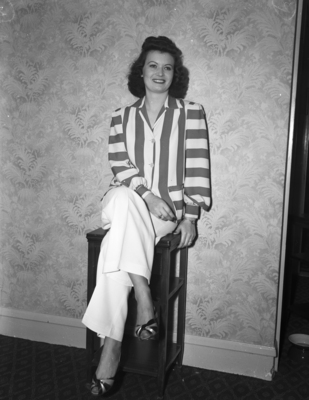 The National Fashion Exhibitors of America are holding their show at the Hotel Texas. Modeling on of the summer styles is Mrs. Angelyn Jerabek. She is sitting cross-legged on an end table, dressed in a two-piece slack suit. The suit consists of tailored white sharkskin trousers and an in-or-out hip-length sharkskin shirt. The shirt has broad red and white stripes with full sleeves, fastened in a tight cuff.