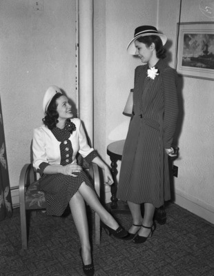 The National Fashion Exhibitors of America are holding their show at the Hotel Texas. Modeling styles for society and business women who strive for impeccable taste in clothes, left to right are Gwendolyn Mann and Martha Kenderdine. Miss Mann is wearing a tailored dress of smooth crepe dotted navy with a hip-length white English linen jacket. The jacket features pearl buttons and is trimmed in the crepe at the collar, cuff, and front. Miss Kenderdine shows a redingote costume of navy and black narrow stripes. Slanting stripe pockets and white lapel gardenia relieve the severeness of the coat over a trim tailored basic dress. Her hat is a combination of rough white straw and black felt.