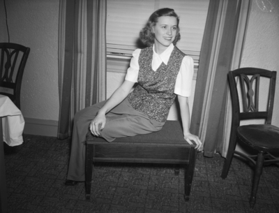 Lynch, J. R. (Mrs.); National Fashion Exhibitors of America; Modeling; Models; Fashion; Jerkin; Ottomans; Chairs; Windows; Draperies; Hotel Texas (Fort Worth, Tex.)
