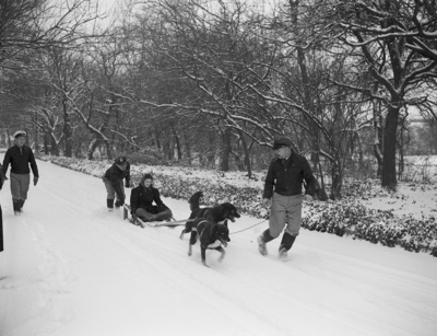 Image shows Nellie Warner is riding on a dog sled being drawn by two Alaskan huskies, Hugo and Millie, from the Forest Park Zoo. This is her first dog team ride. The ground is covered in snow and there are several bare trees in the background. Miss Warner is wearing a coat, trousers and headscarf. Three unidentified men are shown guiding and pushing the sled. Published in Fort Worth Star-Telegram, evening edition, January 22, 1940.