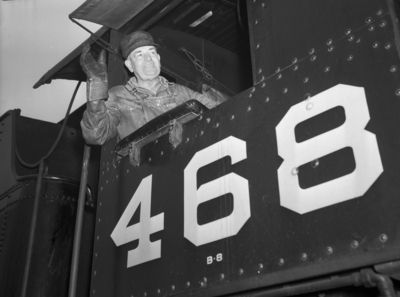 Charles Jerome is an engineer with the Texas and Pacific (T. & P.) Railroad. He has been an employee of the railroad for 41 years. On Tuesday afternoon, he switched his engine into the T. & P. Station for the last time. His friends and family were there to greet him when he finished the last run. The 65-year-old is looking forward to a well earned retirement. He is shown waving from the window of car 468. He is dressed in a cap, button-up shirt, overalls, and gloves.