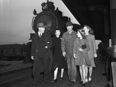 Charles Jerome is an engineer with the Texas and Pacific (T. & P.) Railroad. He has been an employee of the railroad for 41 years. On Tuesday afternoon, he switched his engine into the T. & P. Station for the last time. His friends and family were there to greet him when he finished the last run. The 65-year-old is looking forward to a well earned retirement. He is shown being greeted by his daughter and her family. They are, left to right, Mr. and Mrs. N. U. Malone, Mr. Jerome, Ann Malone (10), and Kathleen Malone (14). Mr. Malone is dressed in a hat, double breasted suit, and a coat. Mrs. Malone is wearing a hat and a coat. Mr. Jerome is dressed in a cap, button-up shirt, and overalls. Ann is wearing a hat, dress and a coat. Kathleen is wearing a long-sleeve dress. There is a train and tracks in the background.