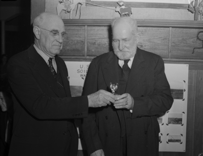 The spotlight fell on several prominent guests at the annual Stamford Chamber of Commerce Banquet. Left to right are Charles E. Coombes and A. J. Swanson, manager of the Swanson Land and Cattle Company. Mr. Coombes is dressed in a three-piece suit. Mr. Swanson is being presented with a trophy after his election as Stamford's most useful citizen. He is wearing a three-piece, double breasted suit. Behind the men is a poster for the military.