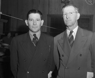 The spotlight fell on several prominent guests at the annual Stamford Chamber of Commerce Banquet. Left to right are Charles Green and Reverend P. D. O'Brien. Mr. Green is the manager of the Chamber of Commerce. He is dressed in a double breasted pinstripe suit. Reverend O'Brien is the Stamford Baptist minister and served as toastmaster. He is wearing a double breasted suit.