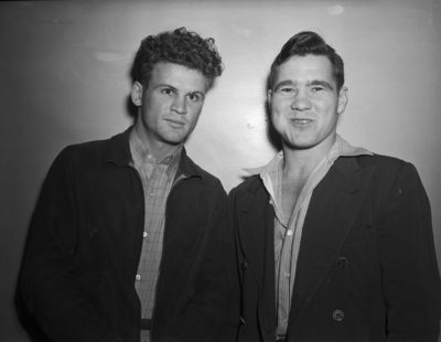 Amateur boxers are competing in the Golden Gloves District Tournament in Fort Worth, Texas. Competing in the tournament, left to right, are Ray Lambert and Bill Anderson. Lambert is a veteran welterweight from Milford, Texas. He is battling for a district championship. He is wearing a button-up shirt, jacket, and trousers. Anderson will face Andy Eagleton in the Middleweight Championship, one of the most anticipated fights of the tournament. Anderson is dressed in a striped button-up shirt and a double breasted blazer.