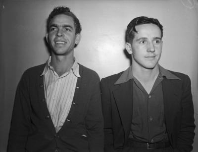 Amateur boxers are competing in the Golden Gloves District Tournament in Fort Worth, Texas. Competing in the tournament, left to right, are Robert Thrasher and Robert Ballew. Thrasher is a 147-pounder and has been excelling in the training school. He is dressed in a striped button-up shirt and a sweater. Ballew is an experienced Glove contender and a promising Class A swinger. He is wearing a collared shirt, blazer, and trousers.