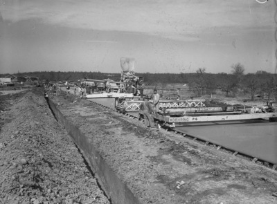 Camp Wolters, one of the Nation's largest Army replacement centers is doubling manpower and adding steam for the finishing drive. One of their projects includes a six-mile concrete highway loop, which will pass through the main camp area. The project is shown reaching the one and a half mile mark.on the 6 mile concrete highway which will pass through the camp. Published in Fort Worth Star-Telegram, evening edition, January 2, 1941.