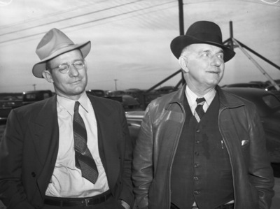 Camp Wolters, one of the Nation's largest Army replacement centers, is working to expand the cantonment. Two members of the contracting firm are left to right Henry Reeves and his father, F. M. Reeves. The contract is held by Gage Brothers and F. M. Reeves and Sons, Incorporated. Henry is dressed in a hat and a double breasted suit. F. M. is wearing a hat, three piece suit and a leather coat. Published in Fort Worth Star-Telegram, morning edition, January 4, 1941.