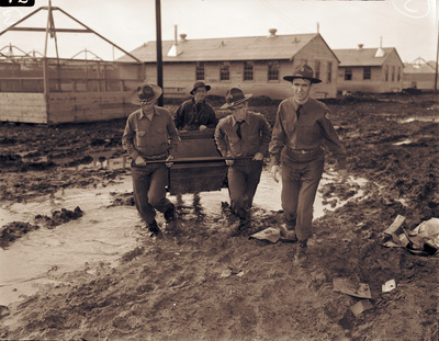 Camp Bowie, Brownwood, Texas, World War II; Pvts. Alton Sorelle, Mason Love (on cart), Garland Holt, and Corporation Claude Addington at Company L, Camp Bowie, 01/05/1941