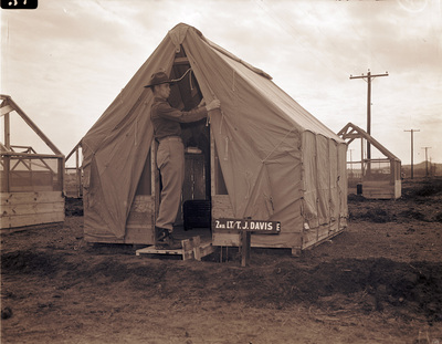 Camp Bowie, Brownwood, Texas, World War II; 2nd Lieutenant Terrell J. Davis, supply officer of Third Battalion, 142nd, adjusts fly on tent, 01/05/1941