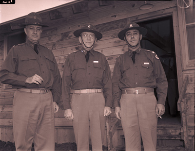 Camp Bowie, Brownwood, Texas, World War II; Texas National Guard, 71st Infantry Brigade, from left, Colonel Nat S. Perrine of 142nd Infantry; Colonel E.A. Eversberg, commander of 71st Brigade, and Lieutenant Colonel Miller Ainsworth, commander of 141st Infantry, 01/06/1941