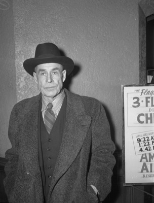 Among the attendees of the American National Livestock Association convention at the Blackstone Hotel was Matt Crowley, of Hebron, North Dakota. He is standing against a blank wall, wearing a suit, overcoat and a hat.