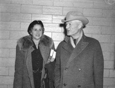 On their way to attend the American National Livestock Association convention at the Blackstone Hotel were Mr. and Mrs. Dan E. Clark, of Ashton, Idaho. They are pictured standing in front of a brick wall after getting off the train at the Texas and Pacific Railway station. Mr. Clark is a member of the executive committee of the association. He is wearing a collared shirt, coat and a hat. Mrs. Clark is wearing a dress, hat and a coat with fur lining around the collar. She is holding a handbag and carrying two books.
