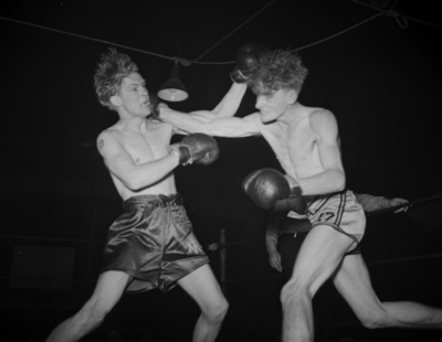 Amateur boxers are preparing for the Golden Gloves District Tournament in Fort Worth, Texas. Competing in a practice round, left to right, are Wayne Penn and Red Bransom. They are two of the favorites in a featherweight division packed with talented young boxers. Bransom is pounding his opponent with a tough right. Penn, the veteran, is back on his heels as he anticipates another punch. Bransom went on to win the decision.