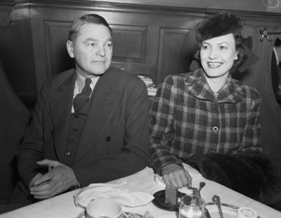 Attending a luncheon during the American National Livestock Association convention at the Blackstone Hotel were Mr. and Mrs. Art Wagoner. They are sitting at a dining table on which there are several plates and utensils. Mr. Wagoner is wearing a three-piece suit and Mrs. Wagoner is wearing a checkered coat and a hat.