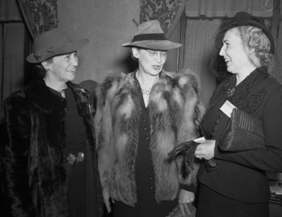 Attending the American National Livestock Association convention at the Blackstone Hotel were, left to right, Mrs. J. M. Keith, of Phoenix, Arizona, secretary of the Arizona Cattle Growers Association; Mrs. Jack Farmer, of Albany, Texas, and Mrs. J. H. Nason, of Spearfish, South Dakota. All three women are wives of ranchers. Both Mrs. Keith and Mrs. Farmer are wearing dresses, fur coats and hats. Mrs. Nason is wearing a dress, blazer and hat. She is holding a pair of gloves and a handbag.