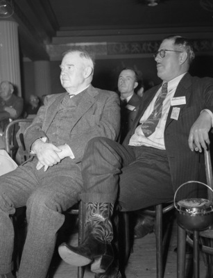 Listening to one of the speakers at the American National Livestock Association convention at the Blackstone Hotel were, left to right, L. C. Brite and George Jones, cattlemen from Marfa, Texas. Mr. Brite is wearing a three-piece suit. Mr. Jones is wearing a pinstripe suit, eyeglasses and cowboy boots. Others in the audience are sitting in the background.