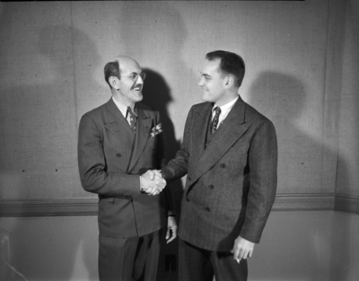 The old and new presidents of the Fort Worth Camera Club are show shaking hands. They are left to right Robert Harris and Don Barker. Mr. Harris is the retiring president. He is dressed in a double breasted pinstripe suit with a pocket square. Mr. Barker is the newly elected president of the club. He is dressed in a double breasted three-piece suit.
