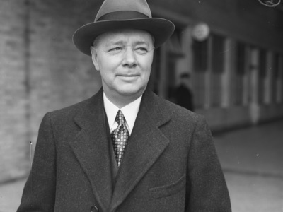 Armour and Company president George A. Eastwood arrived in Fort Worth, Texas, from Chicago, Illinois, to attend the American National Livestock Association convention. He is wearing a suit, coat and a hat.