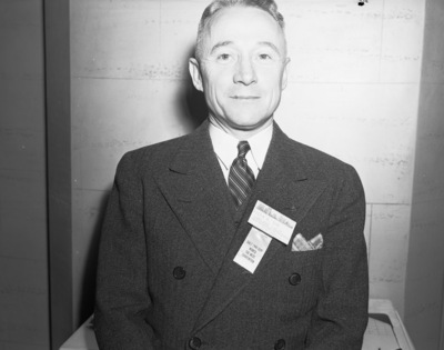 Riles W. Doe, vice president of Safeway Stores, Incorporated, arrived in Fort Worth, Texas, to attend the convention of the American National Livestock Association. He is standing in front of a blank wall, wearing a double-breasted suit and a striped necktie.