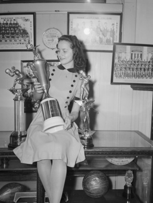 Mary Baker, Texas Wesleyan College freshman shown with the trophy which the Rams were awarded for their tie for the Texas Conference football championship. Baker is wearing a dress and a necklace and is holding the trophy in her lap while sitting on a display case. Beside her are three other trophies sitting on the display case for basketball and golf. Behind her is a wall with pictures of various sports teams. Star-Telegram Morning, January 13 1941.