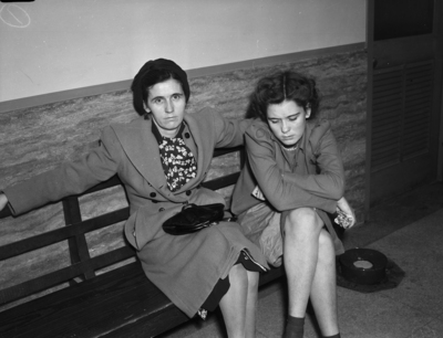 A tragic drama of runaway marriage ended with the groom's death. Virginia Ruth Brewer Cox, fourteen, married nineteen year old H. G. Cox in Fort Worth, Texas. The bride's parents, Mr. and Mrs. Earl T. Brewer, learned of the marriage by postcard, and immediately drove to the city from Ector, Texas. A scuffle broke out between Mr. Brewer and Mr. Cox and the father stabbed the groom in the throat with a pocket knife. The Brewer Murder Trial is being held in Tarrant County, Texas. Sitting on a bench in the hall, left to right are the mother, Mrs. Brewer and the widow, Mrs. Cox. Mrs. Brewer is wearing a floral dress and a coat. Mrs. Cox is wearing a polka-dot dress and a coat.