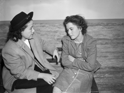 A tragic drama of runaway marriage ended with the groom's death on Friday, January 10th. Virginia Ruth Brewer Cox, fourteen, married nineteen year old H. G. Cox in Fort Worth, Texas Monday night. The bride's parents, Mr. and Mrs. Earl T. Brewer, learned of the marriage by postcard, and immediately drove to the city from Ector, Texas. A scuffle broke out between Mr. Brewer and Mr. Cox and the father stabbed the groom in the throat with a pocket knife. The Brewer Murder Trial is being held in Tarrant County, Texas. Sitting on a bench left to right are Bess Stephenson and the young widow, Mrs. Cox. Miss Stephenson is lending support to her friend. She is dressed in a hat and a trench coat. Mrs. Cox has her arms crossed in front of her. She is wearing a polka-dot dress and a coat.