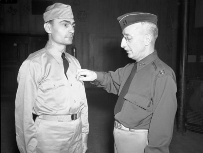 Captain J. B. Calder, right, inspects the uniform of Lieutenant Fred A. Lewis, a member of the Home Defense Guard of Blackstone Post. Captain Calder is also wearing a military uniform as well as eyeglasses. He is grabbing one of the shirt pockets of Lewis's uniform. The Home Guard uniforms were issued at Pioneer Palace when three officers and 66 men were commissioned for duty.