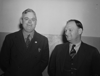 Left to right, Dewey Cornelius and Matt Markum, seen standing side by side. Both men are officers in the Central Trades Assembly. Dewey Cornelius is the Vice President.