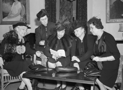 Five of the charter members of the Fort Worth Boys Club Council who were present Monday for the annual Founders' Day luncheon at the Woman's Club. Left to right are Mrs. T. H. Conner, Mrs. Ed Lowdon, Mrs. C. A. Lupton, Mrs. Sam Vaughn and Mrs. J. L. Rawley. The women are seated, looking at a pamphlet held by Mrs. Lupton. Some of them have fur garments and headgear. Three purses are laying on the coffee table in the foreground. Published in the Fort Worth Star-Telegram evening edition, January 14, 1941.