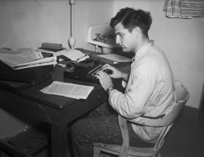 Nolan Sparks, of Panhandle, Texas, Texas Christian University (T. C. U.) halfback, shown sitting at his desk and typing on his typewriter. He is wearing a long-sleeve shirt and trousers. On the desk are several sheets of paper, a newspaper, a box and a stack of books.