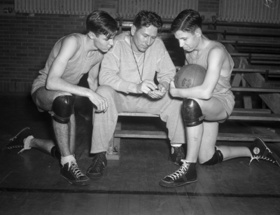J. R. (Rhino) Williams, center, new basketball coach at Paschal High School, shown with two of his players, Jim Henderson, left, and Worth Steward, right. Coach Williams was a former basketball player at North Texas State Teachers College. He is sitting on the bleachers, wearing a sweatshirt and sweatpants. The players are wearing their basketball uniforms and are kneeling on the floor beside Williams. Worth is holding a basketball.