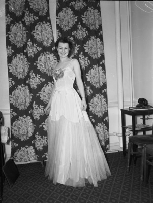 Kathryn Yarborough is a model for the National Fashion Exhibitors of America at Hotel Texas. She is wearing an evening gown. The gown is a yarn dyed taffeta with net fitted petticoat. She is standing, facing slight left and smile. Beside her, at right, is a telephone and book atop a table and a chair. Published in Fort Worth Star-Telegram, morning edition, January 25, 1940.