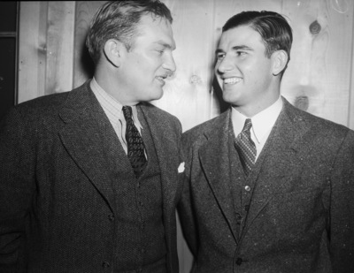 Major League Baseball players are visiting Hicks Airfield, a pilot training field near Saginaw, Texas. Left to right are Jeff Isbell and L. D. "Dutch" Meyer. Mr. Isbell is a supervisor with the Young Men's Christian Association. He is dressed in a three piece suit. Dutch is a young second basemen with the Detroit Tigers. He is wearing a three piece, tweed suit.