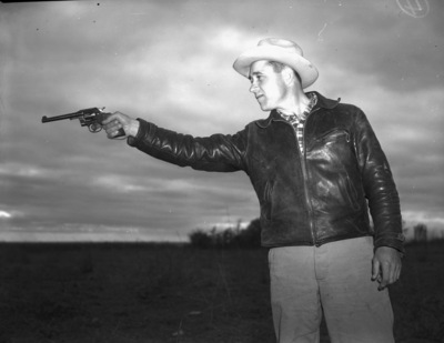 Baseball player Debs Garms is spending the off-season on his 276-acre farm, relaxing with his family and tending the farm. Garms is a left-handed hitting third basemen. He spent four seasons with the St. Louis Browns, three seasons with the Boston Bees, and the 1940 season with the Pittsburgh Pirates. With the Pirates, Garms hit for a.355 average and won a batting title. He is practicing shooting his six-shooter at moving targets. He is dressed in a cowboy hat, plaid shirt, leather jacket, and trousers.