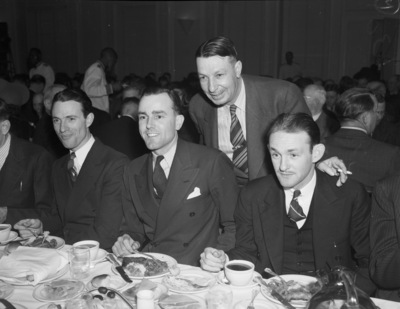 The Fort Worth Chamber of Commerce is holding their annual banquet at the Hotel, Texas. More than 850 guests are in attendance. The out-of-town-guests are sitting at a table. They are left to right T. H. Cleveland, Herman Brown, C. B. Newby, and Joe A. Clark. Mr. Cleveland is from Cleburne, Texas. He is dressed in a double breasted suit. Mr. Brown is the manager of the Cleburne Chamber of Commerce. He is wearing a double breasted suit with a pocket square. Mr. Newby is the president of the Breckenridge Chamber of Commerce. He is wearing a suit and smoking a cigarette. Mr. Clark is a Cisco Chamber of Commerce manager. He is dressed in a three-piece suit.
