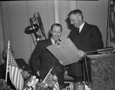 The Fort Worth Chamber of Commerce is holding their annual banquet at the Hotel, Texas. More than 850 guests are in attendance. Left to right at the podium are Hoyt Baird and B. B. Stone. Mr. Baird is the chairman of the continuous membership committee of the Chamber of Commerce. He is dressed in a double breasted suit. He is receiving a framed scroll from Mr. Stone in recognition of his work on the committee. Mr. Stone is president of the Chamber of Commerce. He is dressed in a double breasted pinstripe suit. There is an unidentified man sitting down, his face is obscured with a flag.