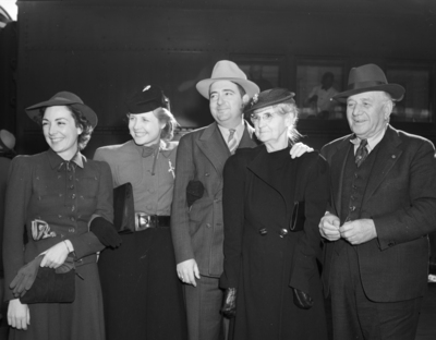 The Sandefer Family is shown meeting at the train station. The three in the middle left to right are Mrs. Gib Sandefer, Gib Sandefer, and Mrs. J. D. Sandefer. There is an unidentified woman at the far left, and unidentified man at the far right. Mrs. Gib Sandefer is wearing a hat, button-up blouse, skirt, and gloves. Her purse is tucked under the crook of her arm. Mr. Sandefer is dressed in a cowboy hat, and a double breasted pinstripe suit. Mrs. J. D. Sandefer is wearing a hat with a veil, a buttoned coat, and leather gloves. The dining car of the railroad train is in the background.