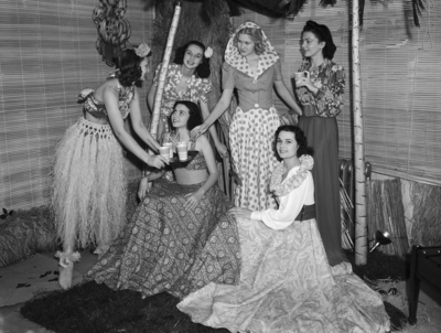 The National Fashion Exhibitors of America are holding their show at the Hotel Texas. Modeling some of the unique costumes at the ten-day event are standing left to right, Mary Lee Jennings, Willette Williams, Grace Reeder, Larry Riggs. Seated are Loraine Scott, left, and Patricia Williams. Mary Lee is dressed in typical Hawaiian dance costume. Willette is wearing a quilted cotton evening dress in aqua blue and white print with a detachable jacket. Grace is wearing a a white pique with red polka-dots and a matching red jacket with a polka-dot hood. Larry is dressed in a tropical silk and draped jersey. The skirt of rust brown has a turquoise belt. Loraine is wearing a cotton print yellow jersey girdle and print matching jacket. Patricia is dressed in a strictly Hawaiian number of very full flowered skirt with white jersey top, green jersey girdle, and a lei.