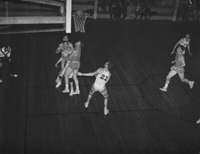 The Texas Christian University (T. C. U.) Horned Frogs are hosting a basketball game against their Southwest Conference rivals, the Texas Longhorns. The Longhorns' center, W. D. Houpt, 28, gave the Frogs trouble all night. He is shown flipping in a field goal from under the basket, despite the close T. C. U. defense. Leonard Cannady, 22 with the Frogs, is standing under the basket, awaiting a potential rebound.