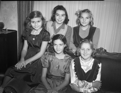 These five students at Alice Carlson School hosted a party for their classmates. The event is being held at the Glen Garden Country Club. Standing left to right, are Jean Ann Marti and Dorothy Helen Moore. Sitting on the couch are Katherine Ann Frank, Joan Armstrong and Gloria Justin. Jean Ann is wearing a collared blouse and a pinafore dress. Dorothy Helen is dressed in a button-up blouse and a velvet pinafore dress. Katherine Ann is wearing a dress with cinched sleeves and a necklace. Joan is wearing a satin dress with puffy sleeves and a heart-shaped necklace. Gloria is dressed in a silk blouse and a pinafore.