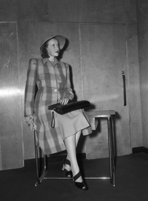 The National Fashion Exhibitors of America are holding a ten-day show at the Hotel Texas. Modeling one of the new styles is Mrs. Margery Carter. She is sitting on the edge of a table, wearing a muted pastel dress with a matching full-length plaid coat, and a curved brim hat. She is holding a pair of gloves and her purse.