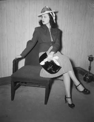 The National Fashion Exhibitors of America are holding a ten-day show at the Hotel Texas. Modeling one of the new styles is Lillie Rostosky. She is sitting on the arm of a chair, wearing a jacket suit in combination with a bright small-figure print frock and a flat brimmed hat. She is clutching pair of gloves and her purse.