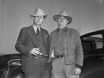 Principals in the stolen car chase and subsequent manhunt near Grapevine, Texas are shown here. They are left to right, Sheriff Roy Moore and Game Warden T. O. Bobbitt, both of Denton., Texas. They spotted the stolen car from Dallas and chased it for four hours through Denton and Tarrant County. The car was later abandoned near Grapevine. The men are standing in front of a Ford, Sheriff Moore is wearing a hat and a three piece, pinstripe suit. He is holding a cigar. Mr. Bobbitt is dressed in a cowboy hat, button-up shirt, jacket, and trousers.