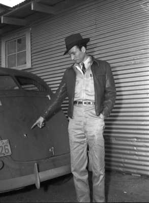 J. L. Fuller, former constable at Grapevine, Texas was one of the officers involved in the stolen car chase and manhunt. He arrived at the stolen car, abandoned in Grapevine along with Sheriff Roy Moore and T. O. Bobbitt of Denton, Texas. Both parties thought the other was the object of the manhunt and exchanged shots. Mr. Fuller is pointing out a bullet hole in the back of his car. He is dressed in a hat button-up shirt, necktie, trousers, and a leather jacket.
