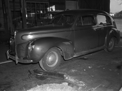 Two boys stole a car from Dallas, Texas, leading police officers all over the area on a car chase and man hunt. Sheriff Roy Moore and Game Warden T. O. Bobbitt, both of Denton., Texas, were the first to spot the stolen car. They chased it for four hours through Denton and Tarrant County. The boys later abandoned the stolen car near Grapevine. The car the boys stole is a Ford Mercury Eight. It is shown parked inside a garage.