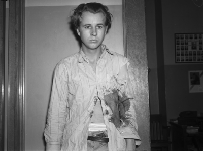 One of the largest manhunts in North Texas spread over two counties and concluded in Grapevine, Texas. A Ford Mercury Eight was stolen and police chased the automobile for four hours. It was then abandoned in Grapevine. One of the boys charged in the automobile theft is Richard W. Williams Junior. The twenty-three year old was shot by one of the officers involved in the manhunt. He is wearing a bloody shirt and trousers, and has a bandage on his chest. The other boy is W. T. Cannon, not pictured. Both boys claimed they were hitch-hiking and denied any connection with the automobile theft.