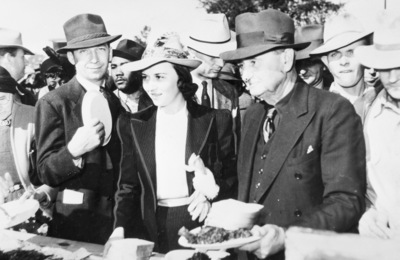 Left to right are, Agnes Killingsworth and father, Mr. Killingsworth. Both father and daughter are from Longview, Texas. Miss Killingsworth is wearing a hat, a striped blazer and a matching skirt. Mr. Killingsworth is dressed in a hat and a three piece suit. There is a crowd of people in the background.