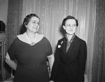 Mrs. Aletha Brown, left, of Beason, Illinois, visited her sister, Mrs. Ollie Newkirk, right, of 2311 Alston Avenue. They are standing next to each other and looking to the right. Mrs. Brown is wearing a dress with accented laced collar and sleeves, and Mrs. Newkirk is wearing a blouse, blazer, skirt and eyeglasses. Mrs. Newkirk is the former Mrs. A. R. Crutchfield. Published in the Fort Worth Star-Telegram evening edition, January 28, 1940.