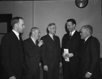 Three Fort Worth alumni of the University of Chicago greeted Robert M. Hutchins, president of the university. They are left to right, Reverend (Rev.) Perry E. Gresham, Charlton Beck, B. C. Shulkey, Mr. Hutchins, and H. C. Burke. Reverend Gresham is the pastor of University Christian Church. He is wearing a suit. Mr. Beck of Chicago, national alumni secretary, is wearing a suit and smoking a cigar. Mr. Shulkey is assistant school superintendent. He is dressed in a double breasted suit. Mr. Hutchins is in Fort Worth, Texas to speak at a dinner at the Women's Club. He is wearing a pinstripe suit. Mr. Burke is chairman of the arrangements committee. He is dressed in a double breasted suit. They are shown after a breakfast at the Fort Worth Club. Published in the Fort Worth Star-Telegram evening edition, January 24, 1940.